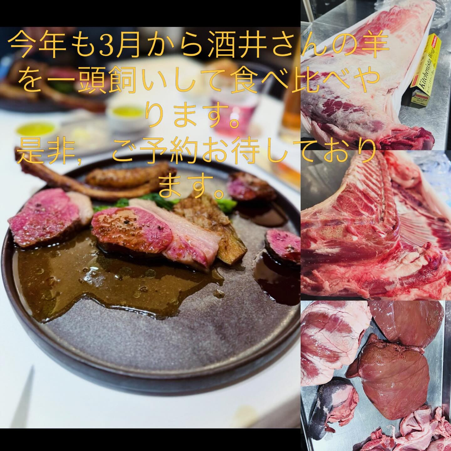 3月からイベント酒井さんの仔羊一頭買い3月からイベント酒井さんの仔羊一頭買い 食べ比べ、内臓もタイミシンがいいと食べれます。 是非,ご予約お待ちしております。 羊好きにはたまりませんよー。